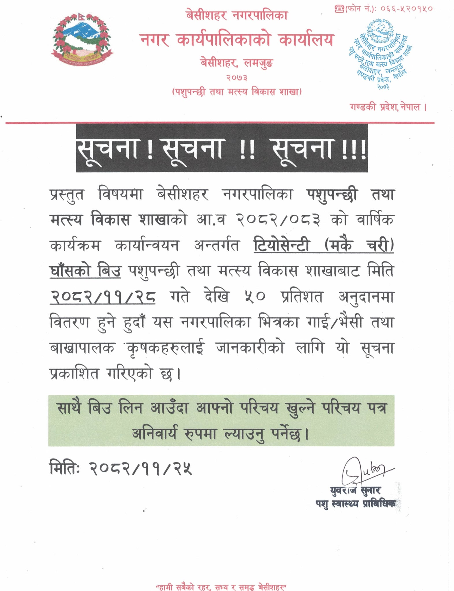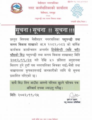टियोसेन्टी (मकै चरी) घाँसको बिउ ५०% अनुदानमा वितरण गरिने सम्बन्धी सूचना।