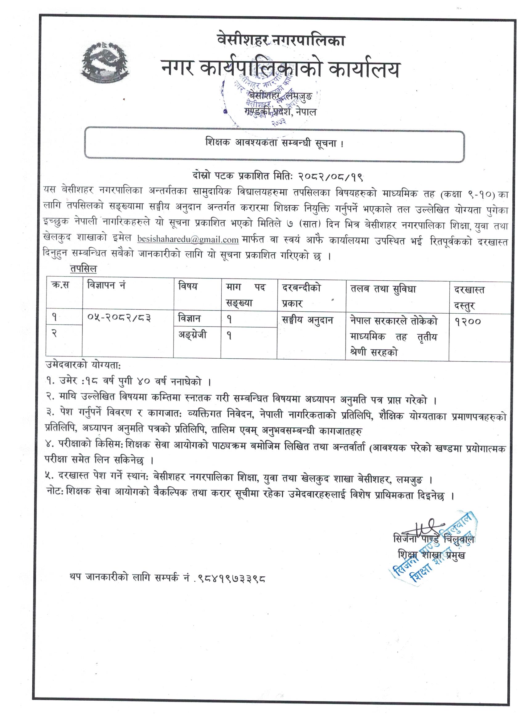 शिक्षक आवश्यकता सम्बन्धी सूचना !