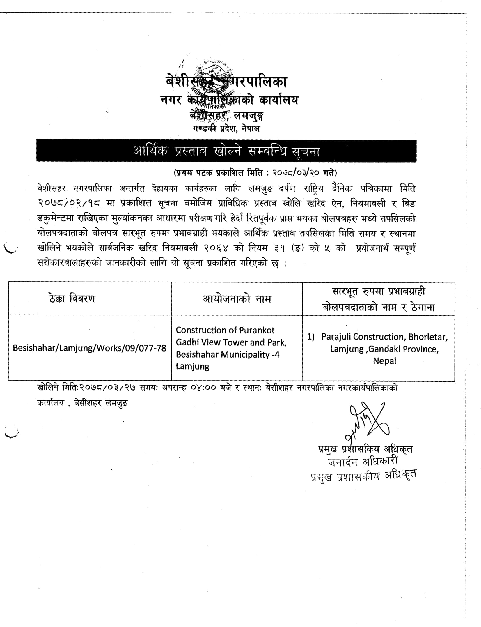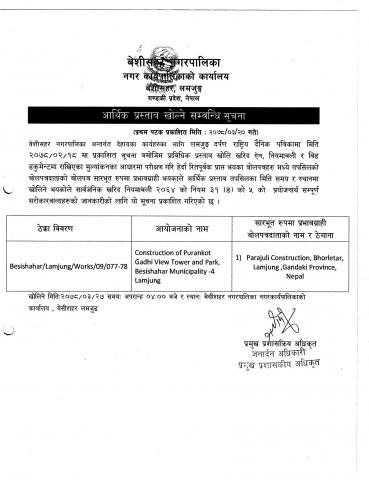 आर्थिक प्रस्ताव खोल्ने सम्बन्धि सूचना ।