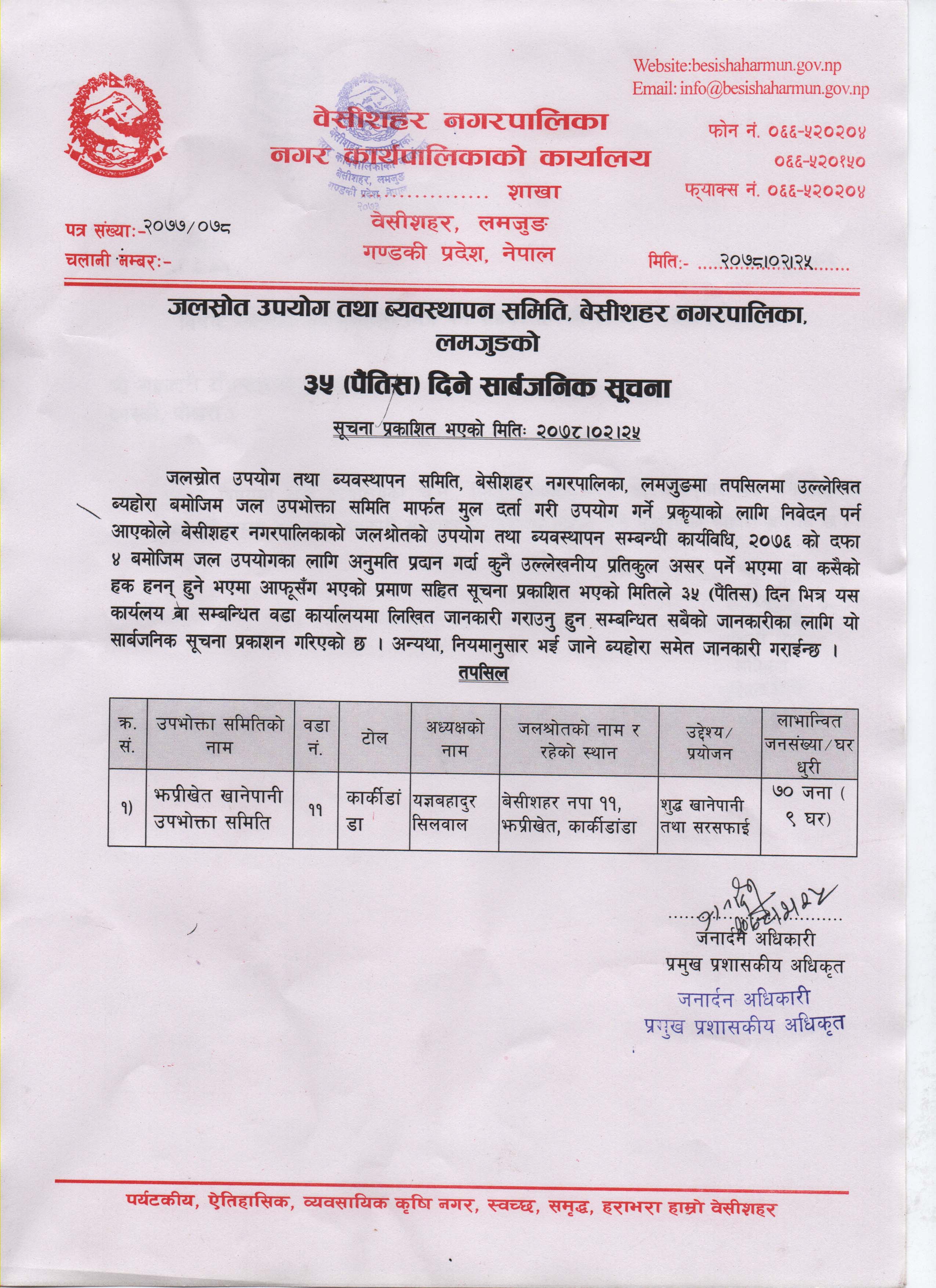 जलश्रोत उपयोग तथा ब्यवस्थापन समिति, बेसीशहर नगरपालिका, लमजुङको ३५ दिने सार्बजनिक सूचना ।