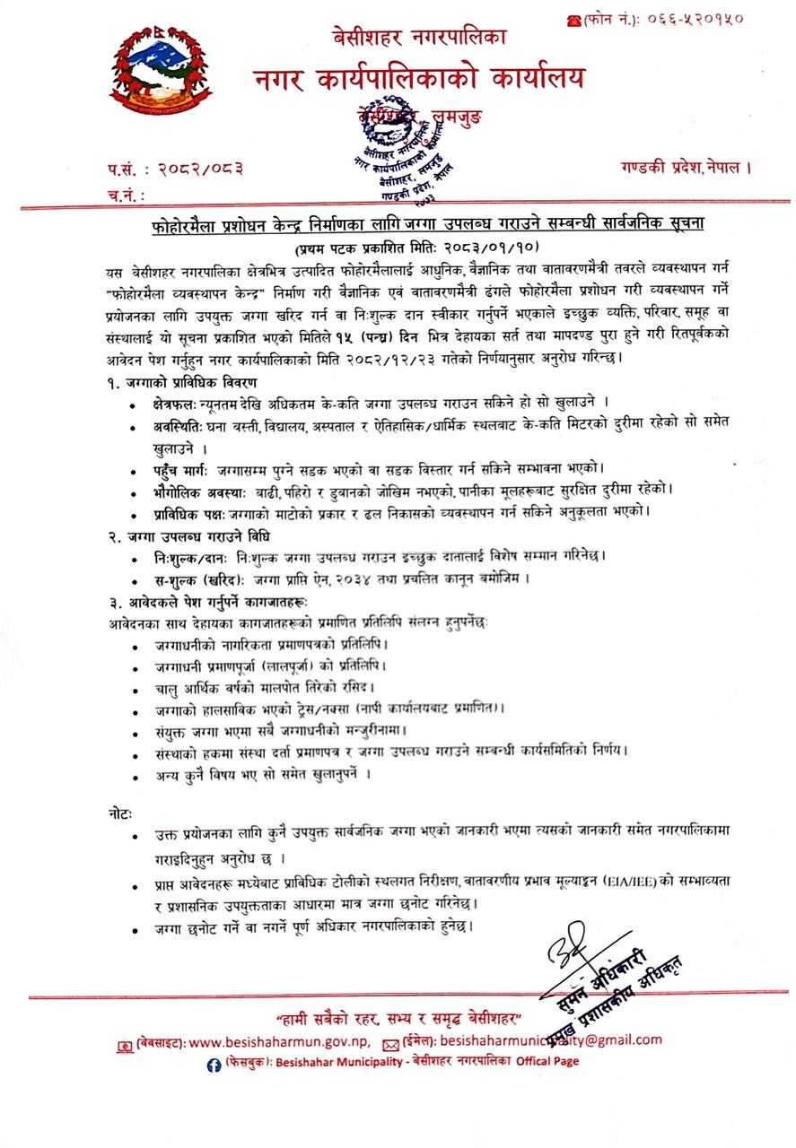 फोहोरमैला प्रशोधन केन्द्र निर्माणका लागि जग्गा उपलब्ध गराउने सम्बन्धी सार्वजनिक सूचना ।
