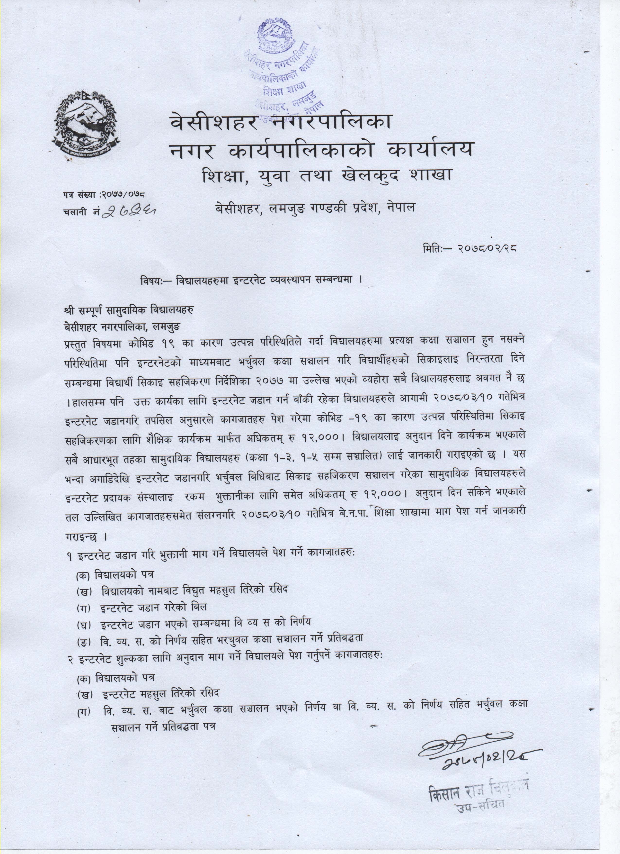 विद्यालयहरुमा इन्टरनेट व्यवस्थापन सम्बन्धमा । (बे. न. पा. स्थित श्री सम्पूर्ण सामुदायिक विद्यालयहरु )