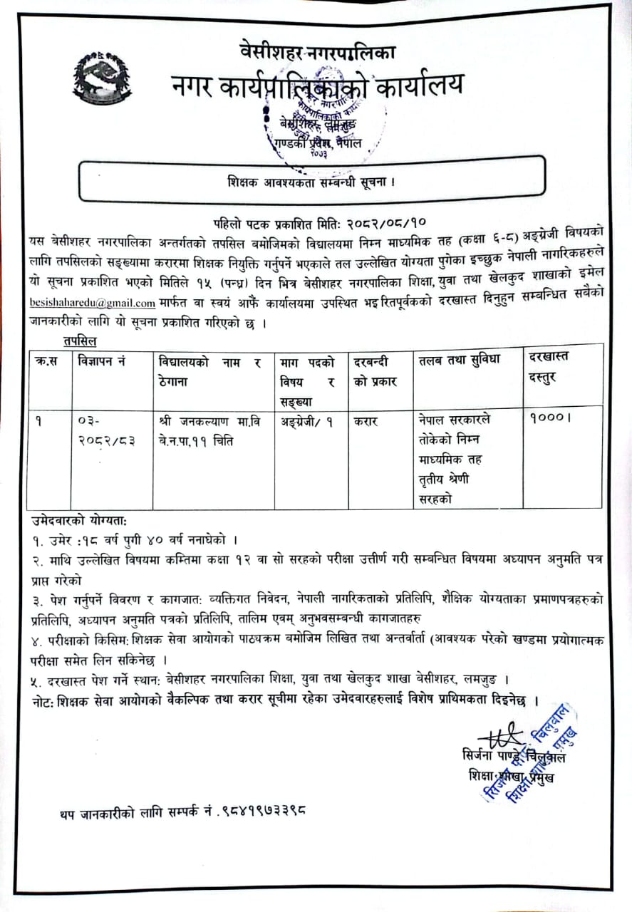 शिक्षक आवश्यकता सम्बन्धी सूचना !