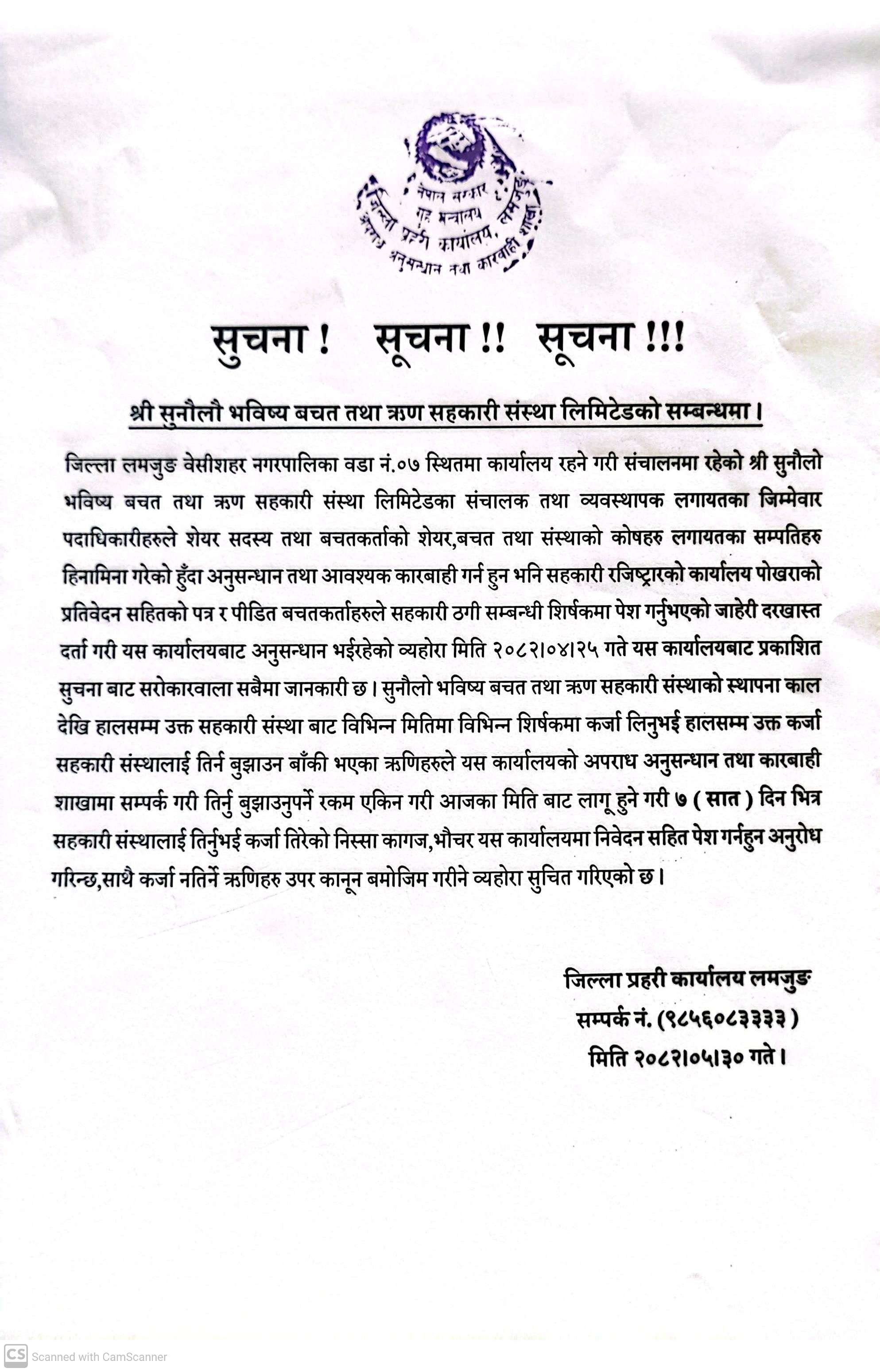 श्री सुनौलो भविष्य बचत तथा ऋण सहकारी संस्था लिमिटेडबाट कर्जा लिएका ऋणीहरुले कर्जा फिर्ता गर्ने सम्बन्धमा