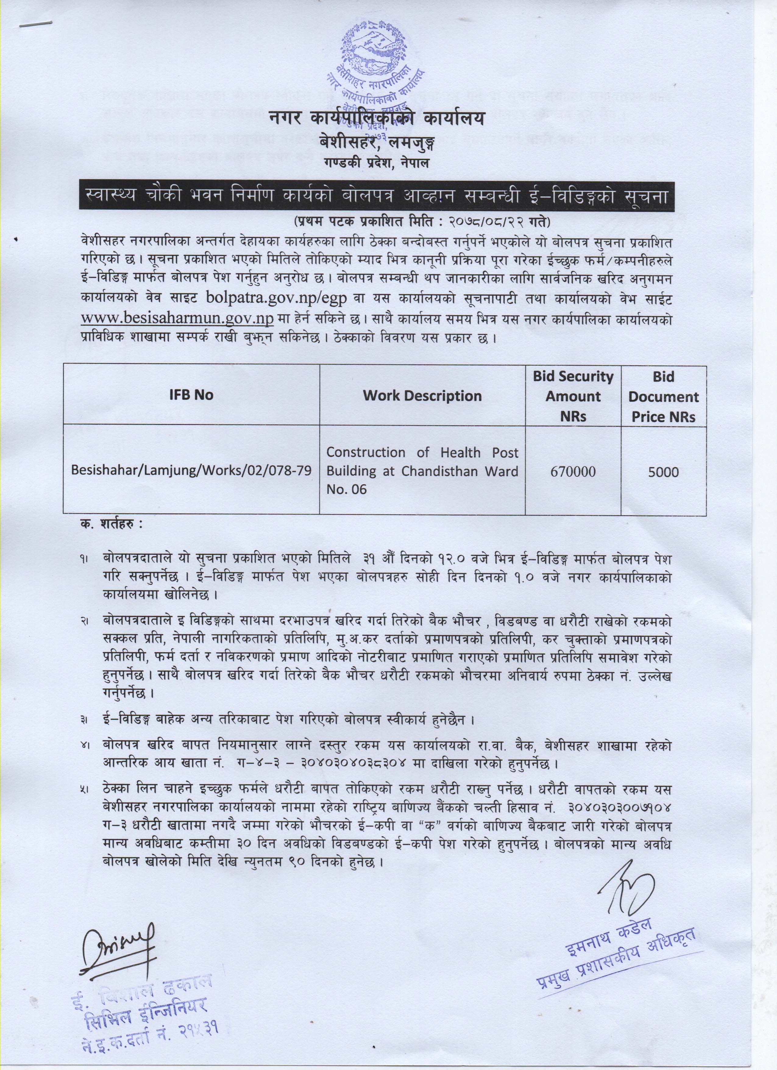 स्वास्थ्य चौकी भवन निर्माण कार्यको बोलपत्र आव्हान सम्बन्धी ई-विडिङ्गको सूचना ।
