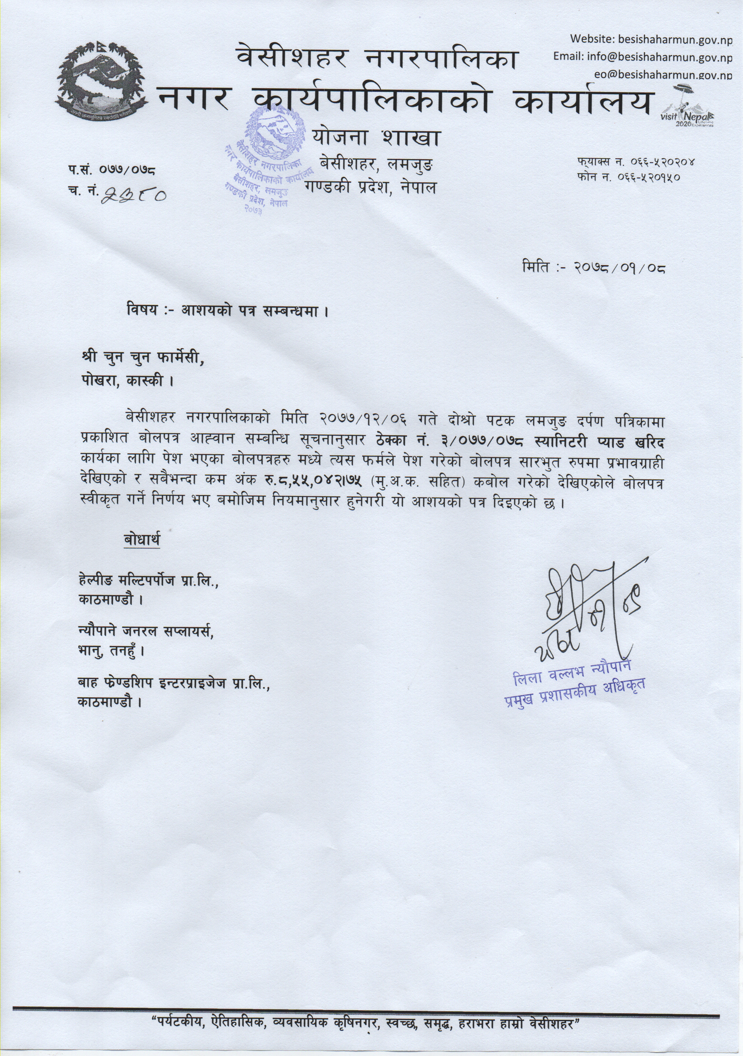 आशयको पत्र सम्बन्धमा । (ठेका नं. ०३/०७७/०७८)