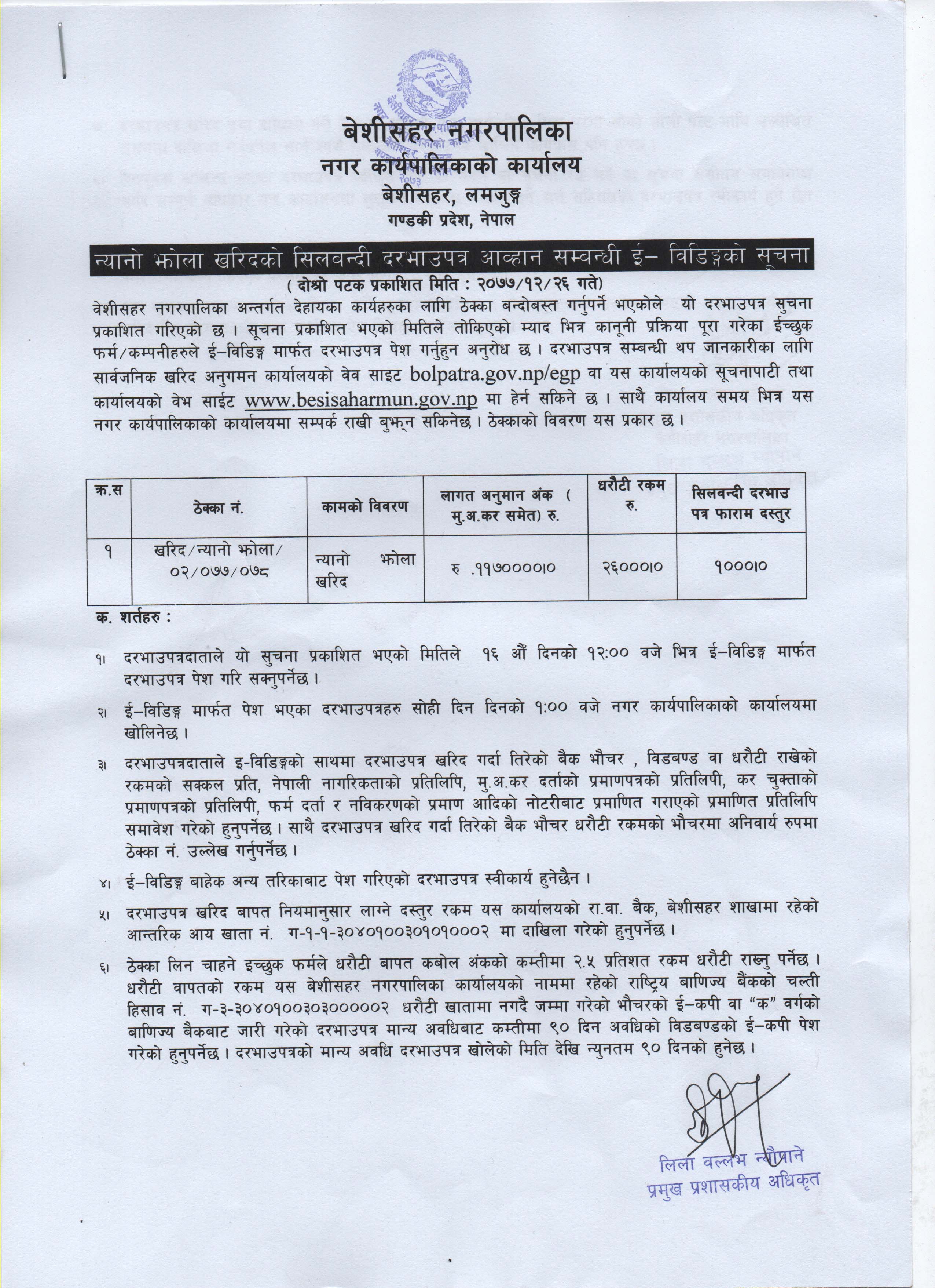 न्यानो झोला खरिदको सिलबन्दी दरभाउपत्र आव्हान सम्बन्धी ई-विडिङ्गको सूचना