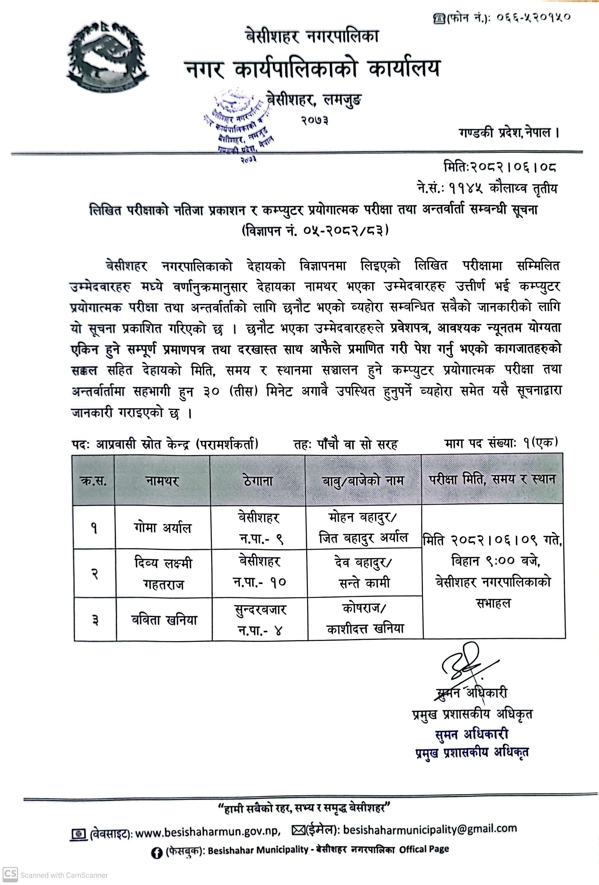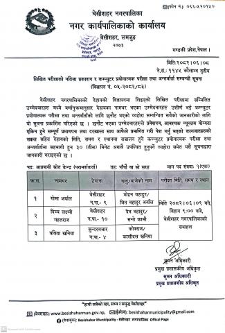 लिखित परीक्षाको नतिजा प्रकाशन र कम्प्युटर प्रयोगात्मक परीक्षा तथा अन्तर्वार्ता सम्बन्धी सूचना ।